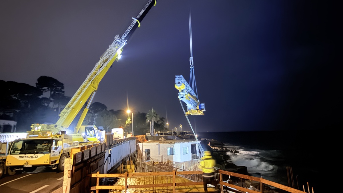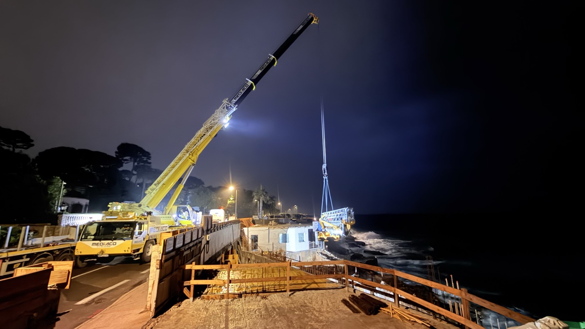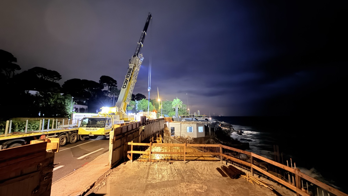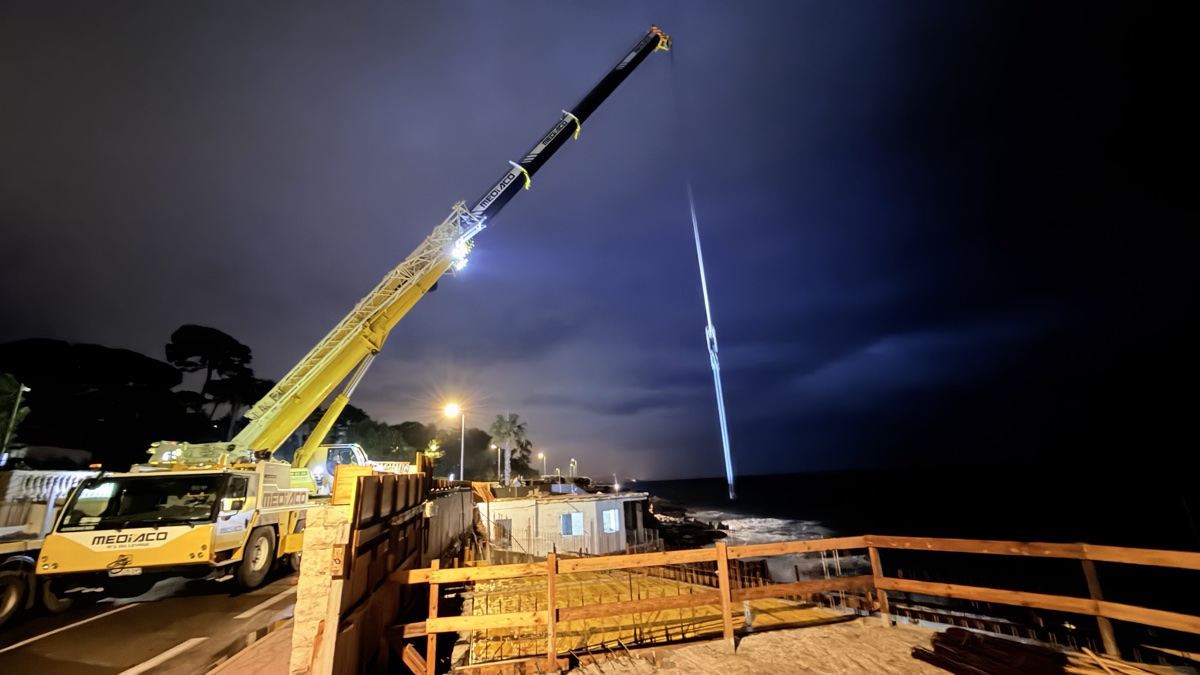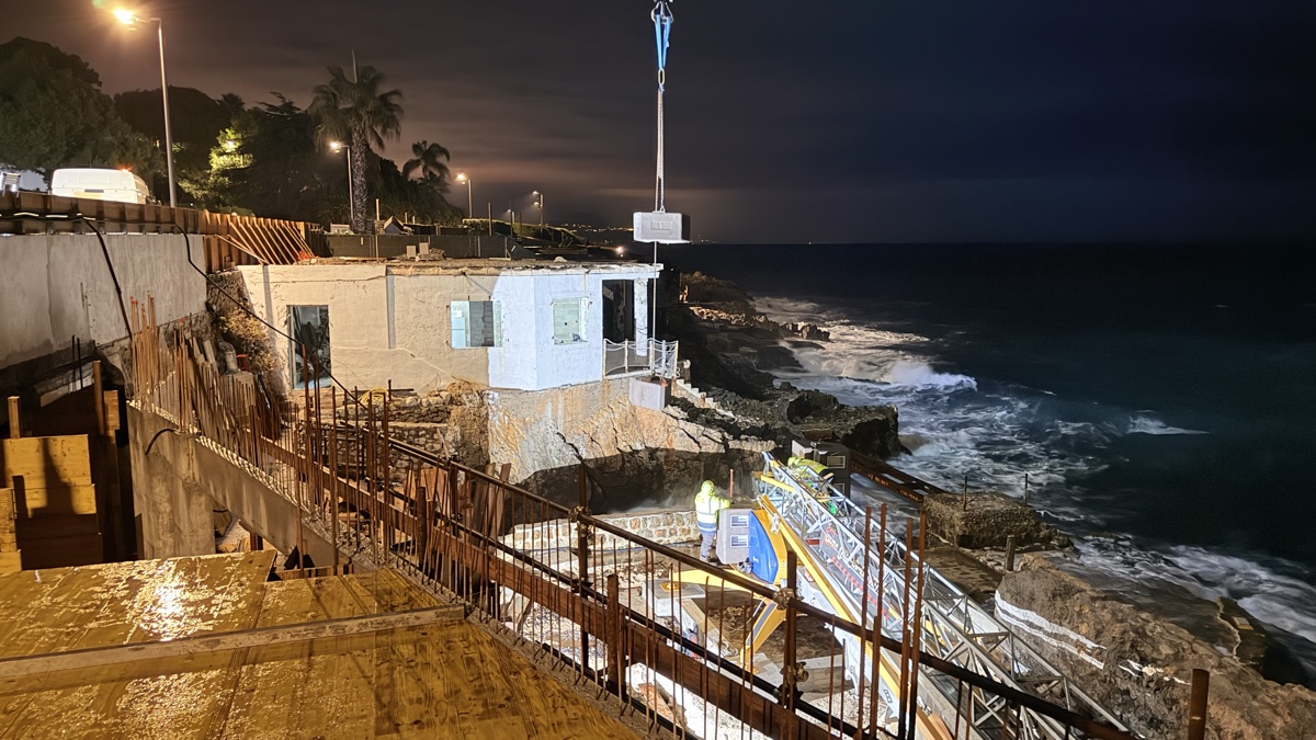 De jour, le résultat est tout aussi impressionnant. La base de la grue, solidement ancrée avec ses contrepoids, surplombe la Méditerranée sur un promontoire rocheux. Le filet de sécurité orange délimite la zone de travail tandis que la flèche, désormais opérationnelle, domine le littoral du Cap d’Antibes.
