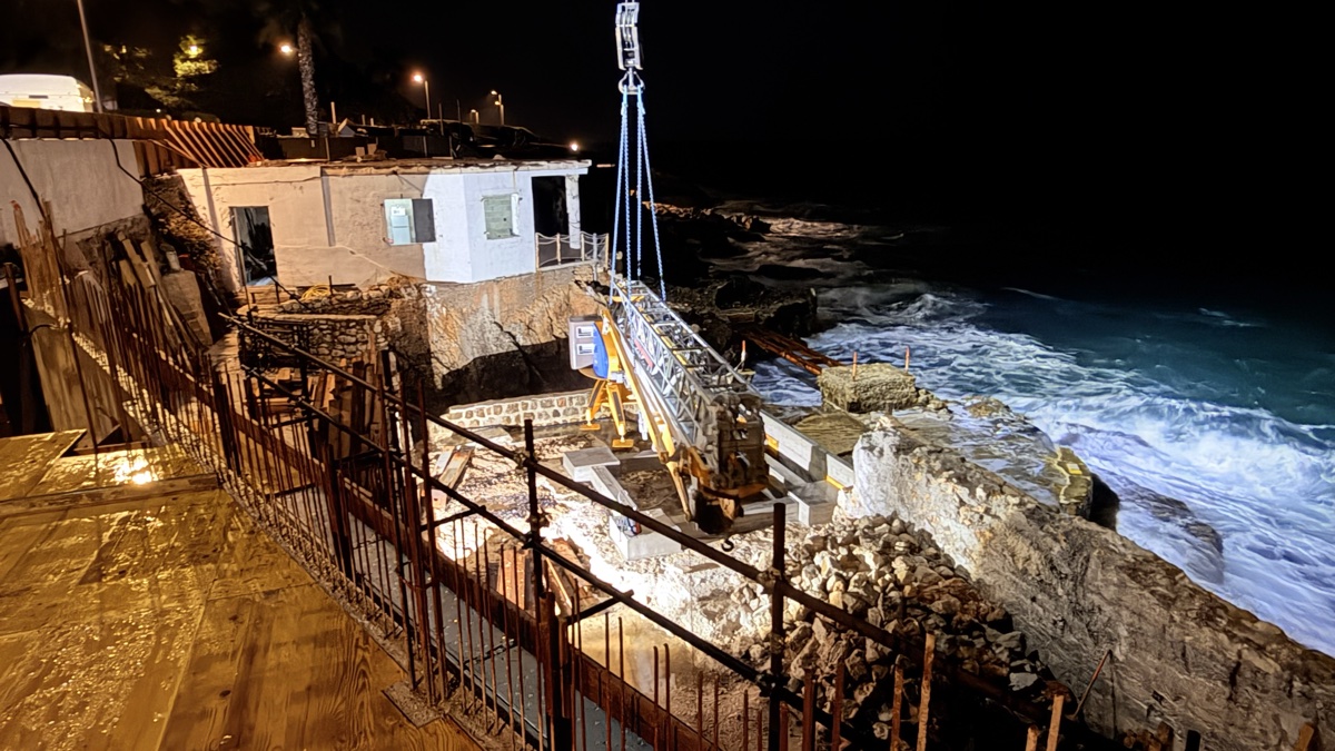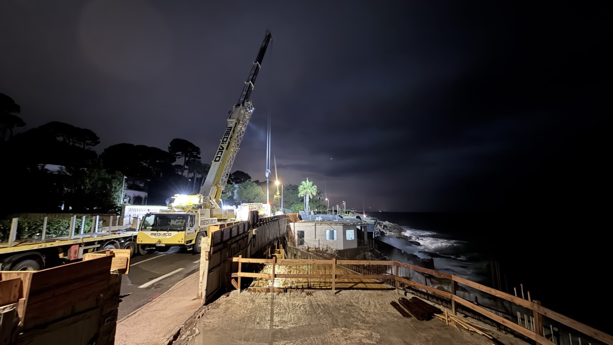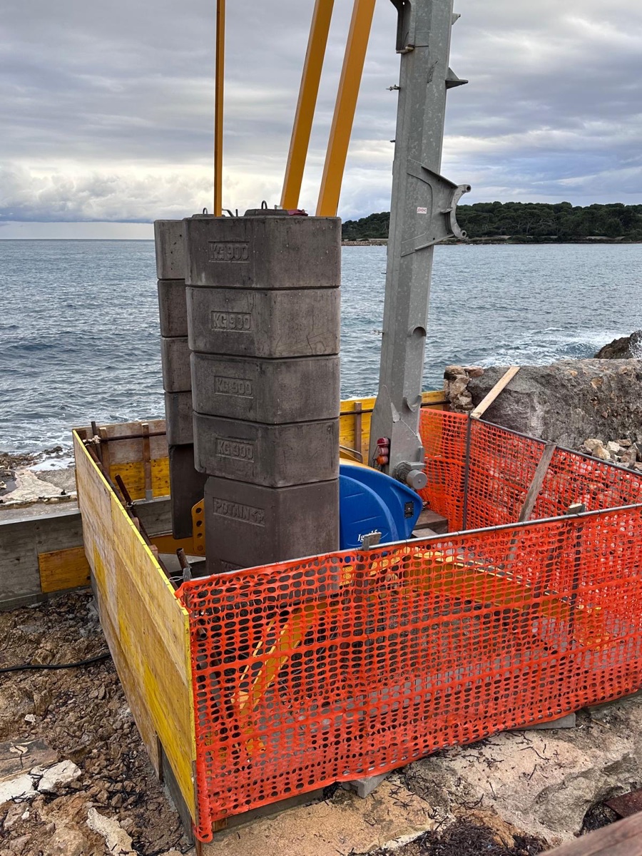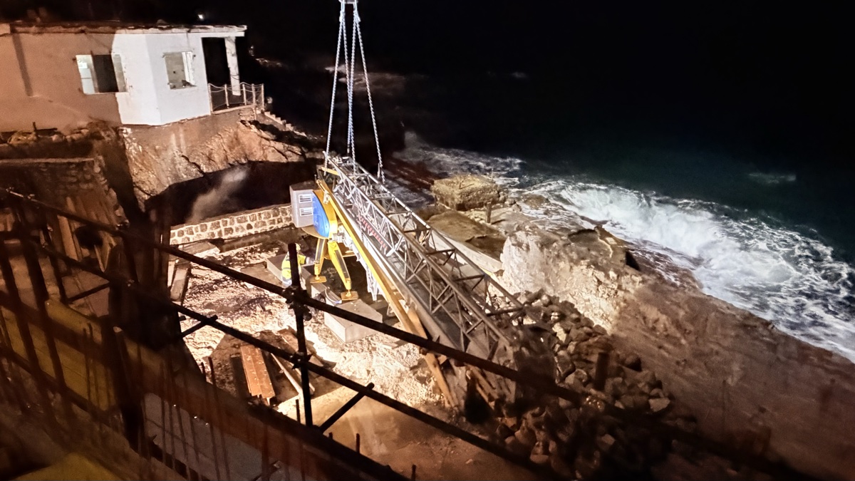 De jour, le résultat est tout aussi impressionnant. La base de la grue, solidement ancrée avec ses contrepoids, surplombe la Méditerranée sur un promontoire rocheux. Le filet de sécurité orange délimite la zone de travail tandis que la flèche, désormais opérationnelle, domine le littoral du Cap d’Antibes.