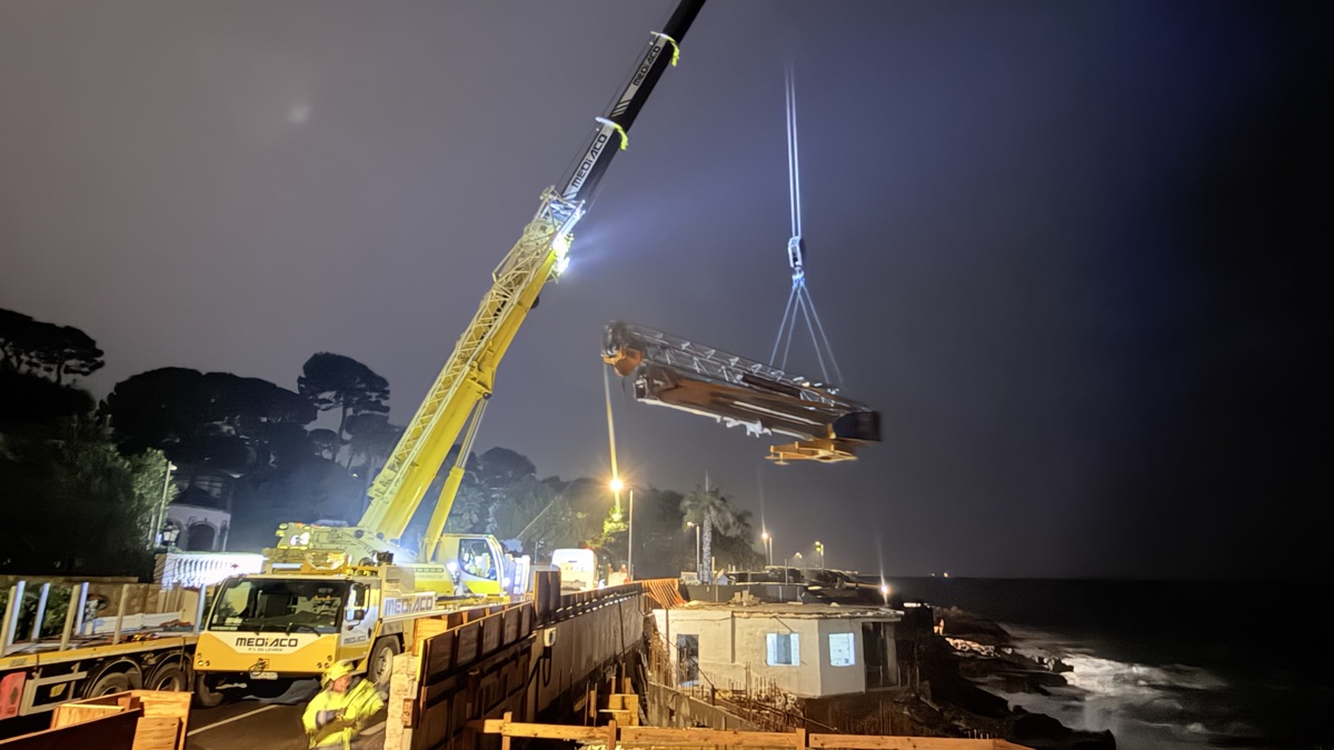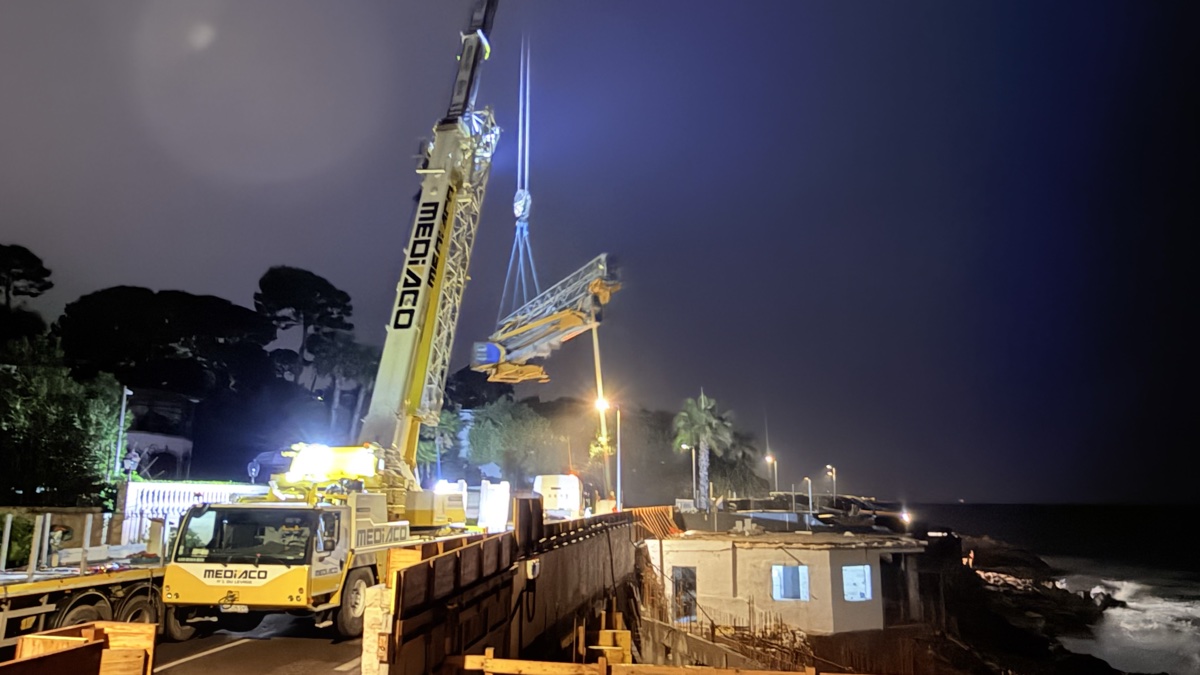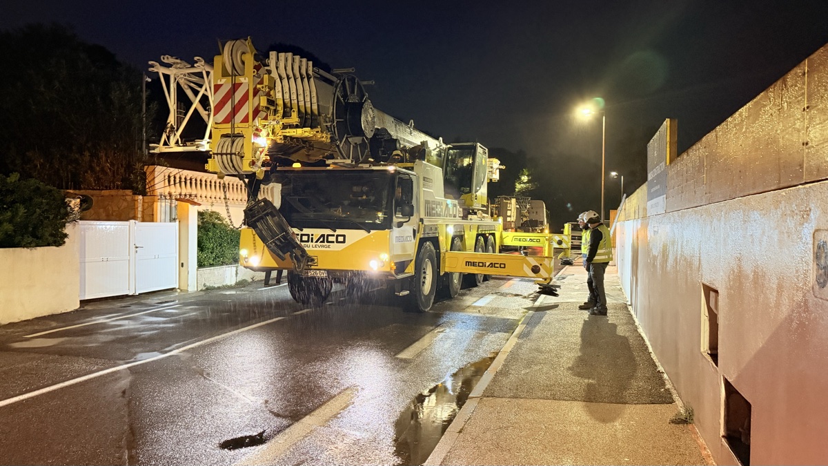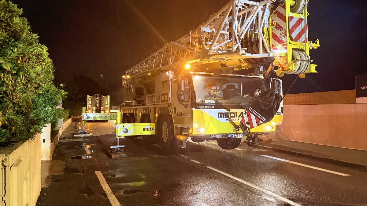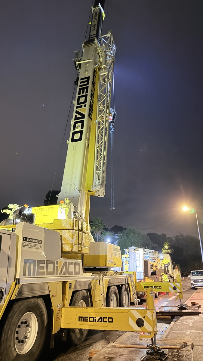 C’est un spectacle à lui seul. La grue mobile Liebherr, opérée par Mediaco, fait son entrée sur le boulevard. Ce mastodonte de plusieurs dizaines de tonnes, avec sa flèche repliée sur le dos, se faufile entre les murs du Cap d’Antibes avec une précision chirurgicale. Pas de place pour l’erreur ici : chaque centimètre compte.