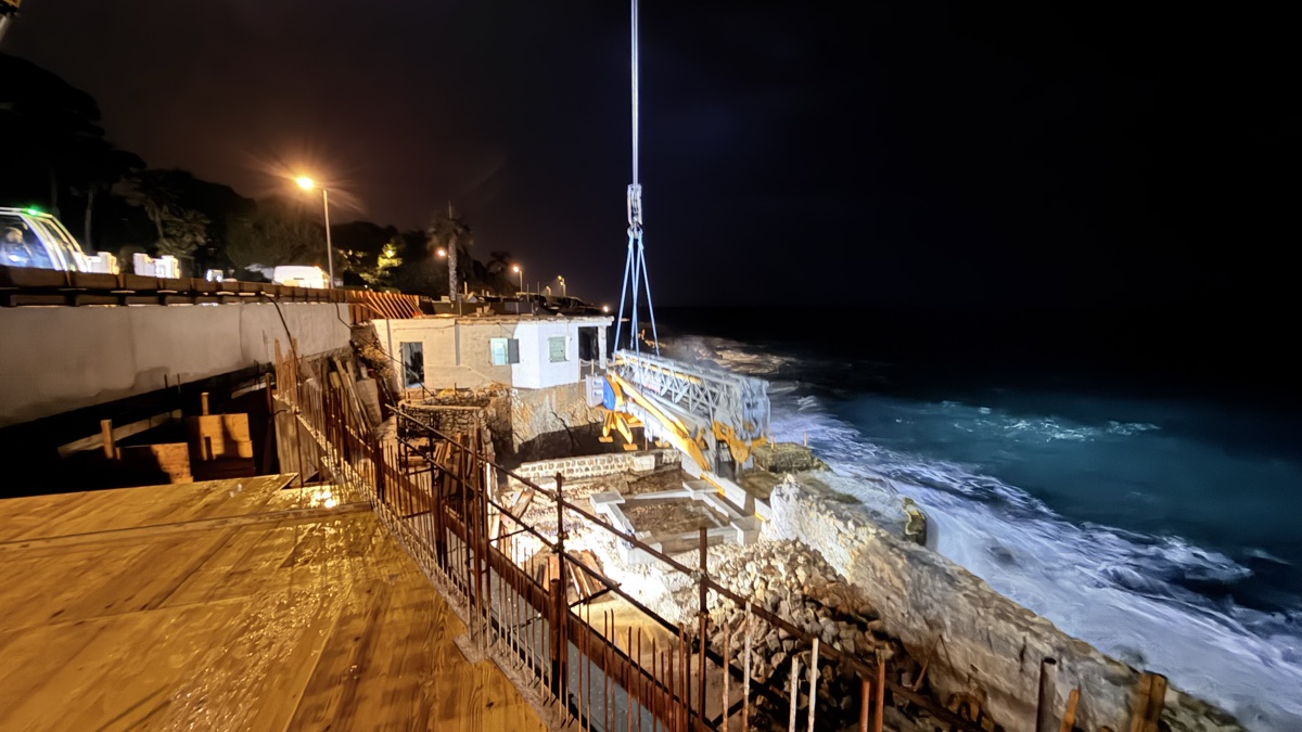 Le défi est immense : entre la houle qui frappe les rochers, le vent marin, et l’espace ultra-restreint entre la route et la mer, chaque mouvement doit être calculé au centimètre près. Les sections de la flèche traversent le ciel comme des silhouettes métalliques suspendues dans le vide, guidées par les signaux lumineux des ouvriers en contrebas. C’est de la haute précision, sous pression, de nuit, les pieds (presque) dans l’eau.